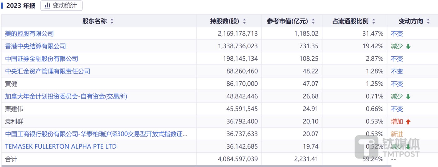 此外,截至2023年9月末,瑞银集团(UBS AG)持有美的集团4403万股股份,持股比例为0.64%,到了年末,瑞银集团已退出美的集团十大股东之列。