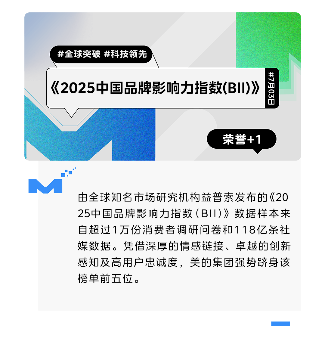 7月3日,益普索《2025中国品牌影响力指数(BII)》100强榜单正式发布,深入探究新情境下的消费者心智,揭示品牌在消费者心中的真实影响力。凭借深厚的情感链接、卓越的创新感知及高用户忠诚度,美的集团强势跻身该榜单前五位。