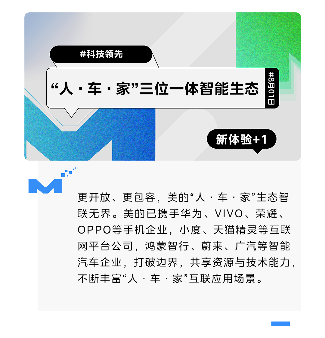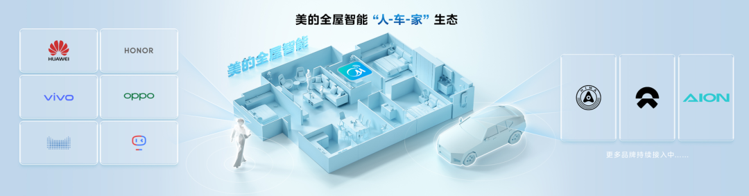 更开放、更包容,美的“人·车·家”生态智联无界。美的已携手华为、VIVO、荣耀、OPPO等手机企业,小度、天猫精灵等互联网平台公司,鸿蒙智行、蔚来、广汽等智能汽车企业,打破边界,共享资源与技术能力,不断丰富“人·车·家”互联应用场景。