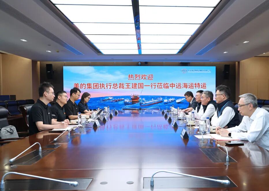 美的集团智能家居事业群ISCC总经理施成贵、智能家居事业群ISCC供应商共创中心部长沈建军、智能家居事业群ISCC供应商共创中心海运采购管理任欢欢;中远海运特运副总经理张驰、董事会秘书莫非梁,泛美经营部、全球销售中心相关负责人参加了会谈。