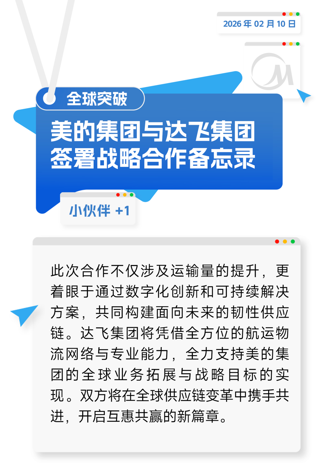 2026年2月10日,美的集团与全球海陆空运输与物流解决方案领军者达飞集团(CMA CGM)正式签署战略合作备忘录(MOU),旨在深化双方全球范围内的战略协作,共同探索物流与技术创新,打造更智能、高效、可持续的端到端供应链解决方案。