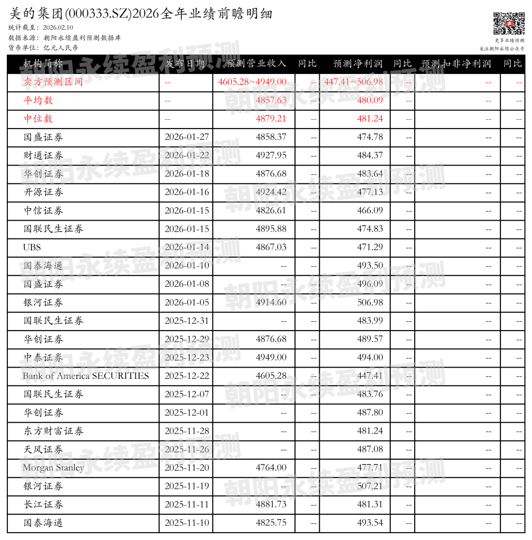 截至2026年02月10日,根据朝阳永续季度业绩前瞻数据: