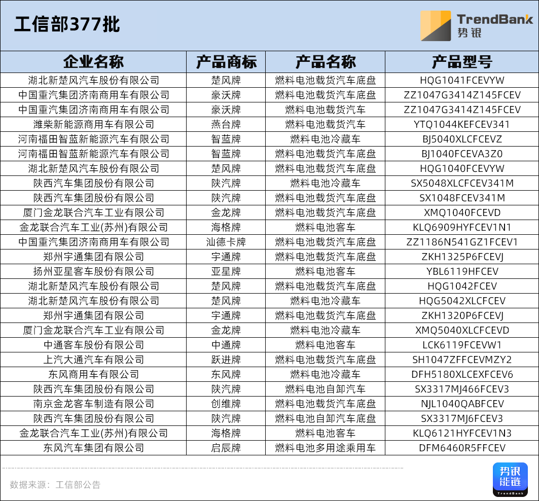 近日,工信部发布了《道路机动车辆生产企业及产品》(第377批)的公告。据统计,在本次公告中燃料电池产品共13户企业26款型号。