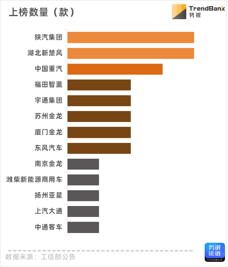 其中,陕汽集团、湖北新楚风并列第一,均上榜4款;中国重汽位居第二,上榜3款;福田智蓝、宇通集团、苏州金龙、厦门金龙、东风汽车(含东风商用车)均上榜2款;其余企业均为1款。