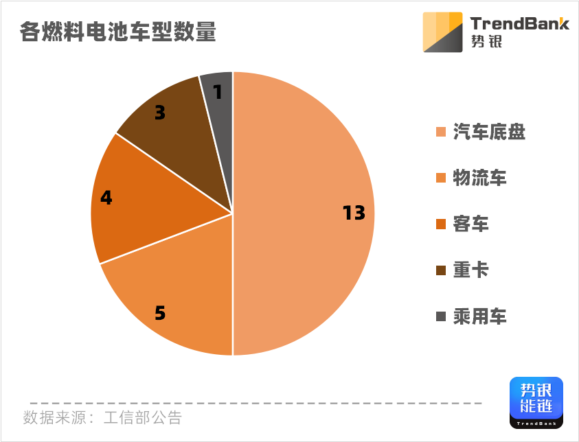 从产品类型看,此次上榜的26款燃料电池产品种类共有5种,其中汽车底盘上榜数量第一,为13款;其次是物流车,为5款;客车第三,为4款;重卡为3款;乘用车为1款。