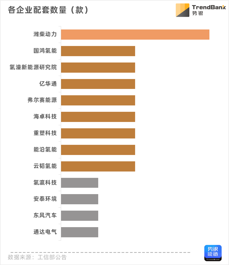 从配套企业来看,此次燃料电池汽车产品配套的有潍柴动力、国鸿氢能、氢潼新能源研究院、亿华通、弗尔塞能源、海卓科技、重塑科技、能沿氢能、云韬氢能、氢瀛科技、安泰环境、东风汽车、通达电气等13家燃料电池企业。