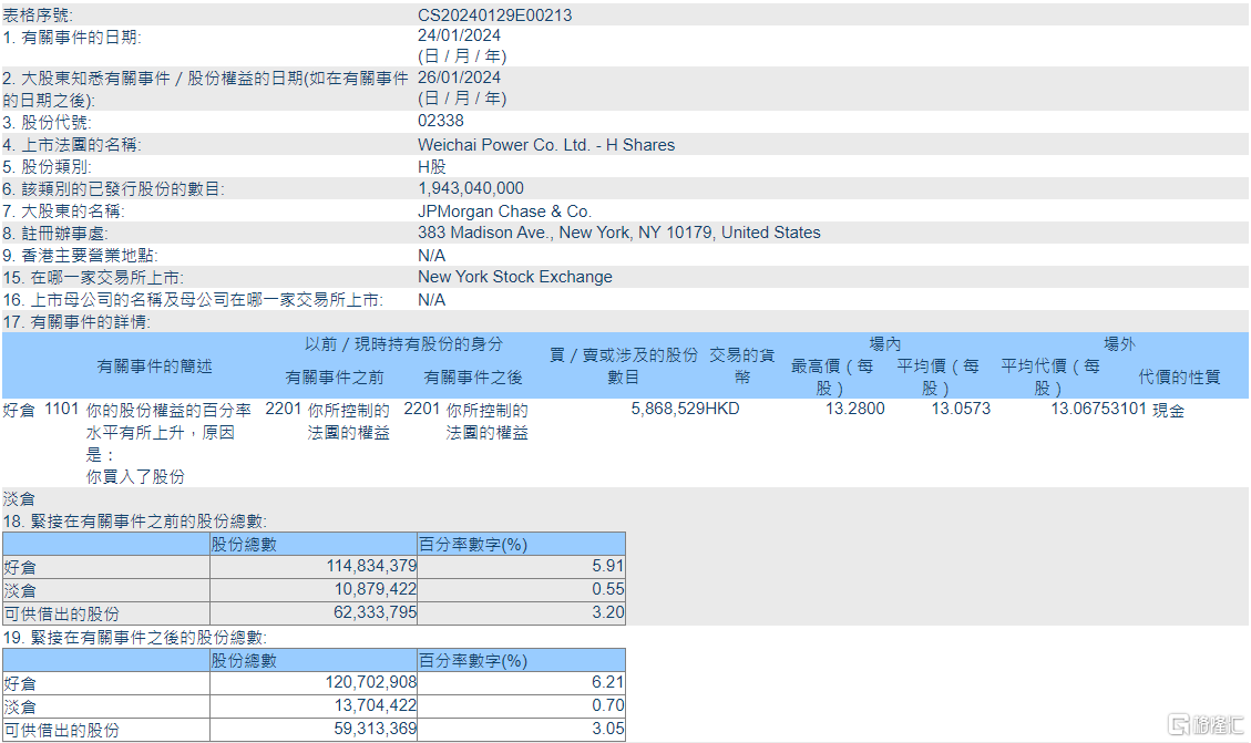 格隆汇1月31日丨根据联交所最新权益披露资料显示,2024年1月24日,潍柴动力(02338.HK)获JPMorgan Chase & Co.以每股均价13.0573港元增持好仓586.85万股,涉资约7662.71万港元。