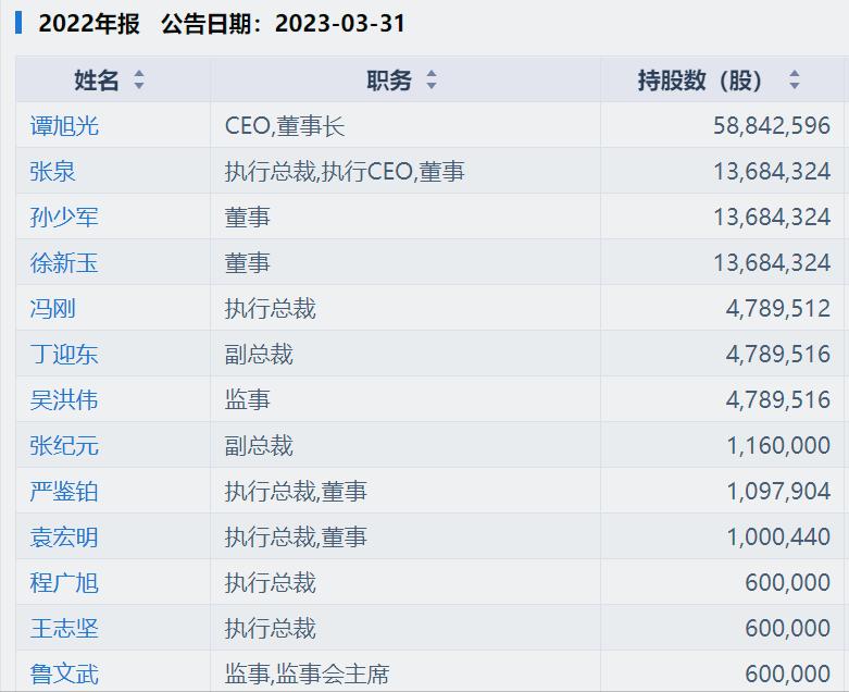 因实施股权激励,潍柴动力多位高层持有股份从几十万到数千万股不等。截至2023年三季报时,董事长兼CEO谭旭光持有5884万股,占比0.67%,位列前十大股东。张泉等3位高层持股应该也超过千万。