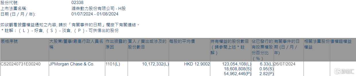 格隆汇8月1日丨根据联交所最新权益披露资料显示,2024年7月26日,潍柴动力(02338.HK)获JPMorgan Chase & Co.以每股均价12.9002港元增持好仓1017.23万股,涉资约1.31亿港元。