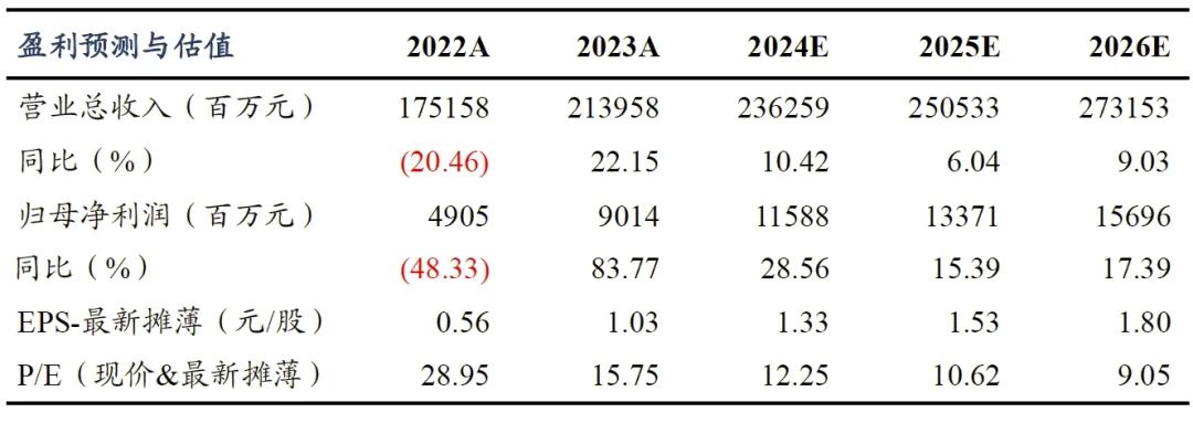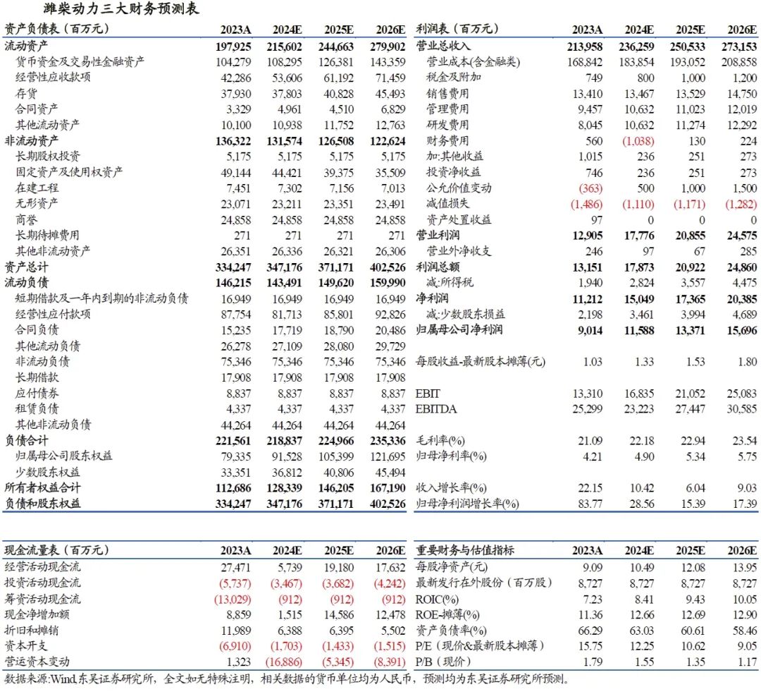潍柴动力重卡全产业链覆盖叠加大缸径发动机业务增量确定性较强,我们维持公司 2024~2026年盈利预测,归母净利润分别为115.88/133.71/156.96亿元,分别为同比+28.56%/+15.39%/+17.39%,对应 EPS分别为1.33 /1.53/1.80元,对应PE分别为12.25/10.62/9.05倍,维持“买入”评级。