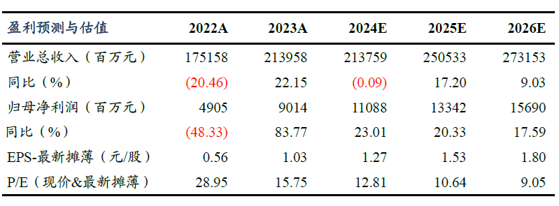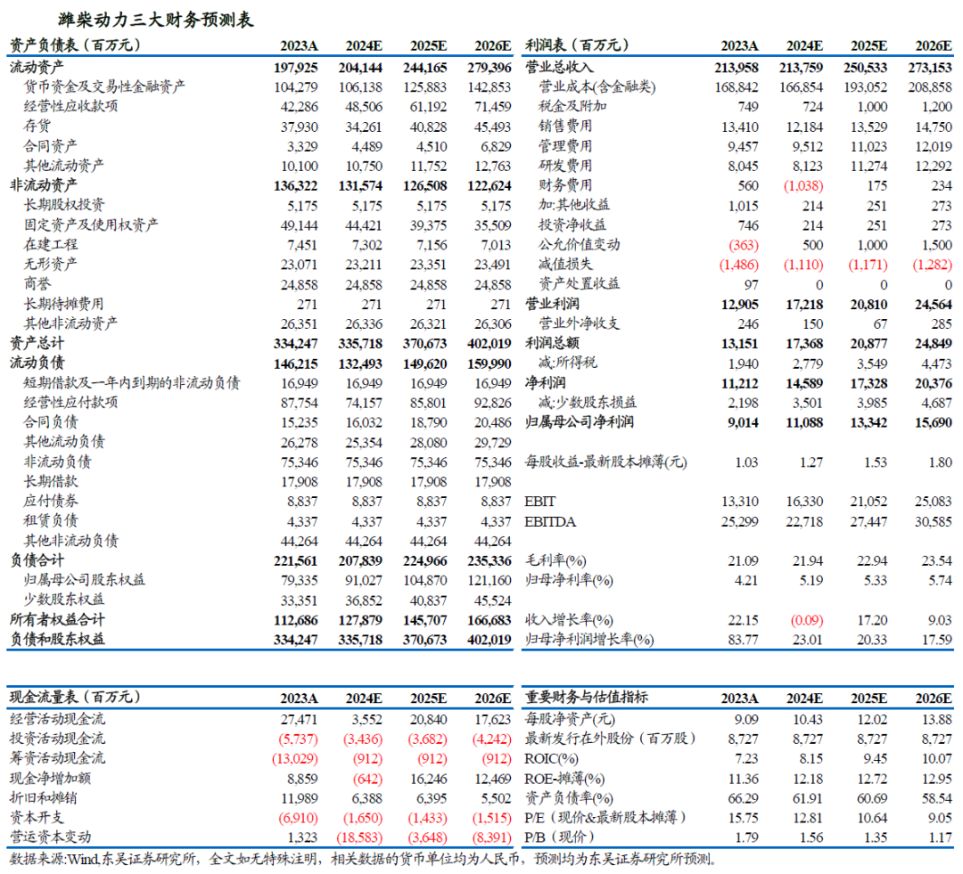 考虑24H2天然气重卡销量下滑,我们下调 2024年盈利预测,2024~2026年归母净利润111//133/157亿元(原116/133/157),对应 EPS分别为1.27 /1.53/1.80元,对应PE分别为12.81/10.64/9.05倍,考虑公司当前估值较低且龙头地位稳固,维持“买入”评级。