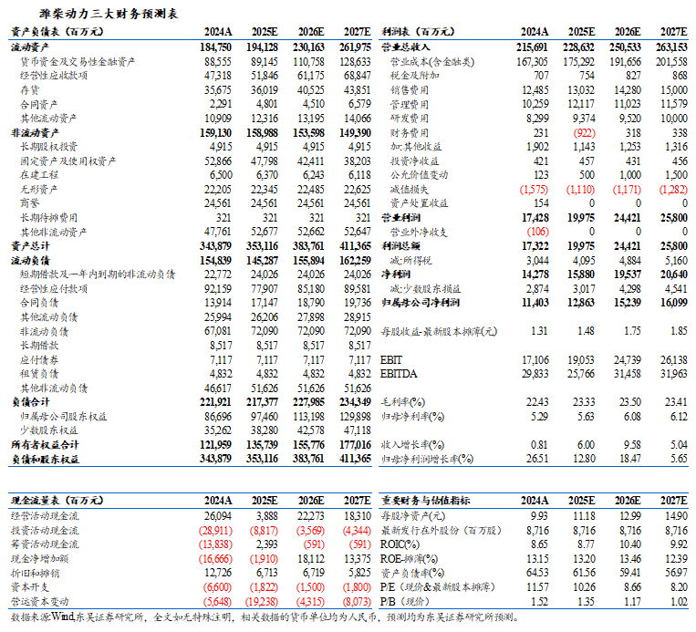 2025年重卡行业迎来复苏,公司作为发动机龙头强者恒强,我们基本维持2025~2027年归母净利润预测129/152/161亿元,2025~2027年对应 EPS分别为1.48 /1.75/1.85元,对应PE分别为10.26/8.66/8.20倍,考虑公司当前估值较低且龙头地位稳固,维持“买入”评级。