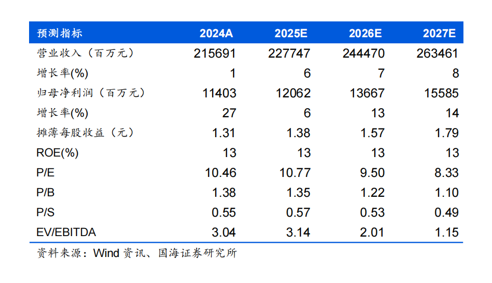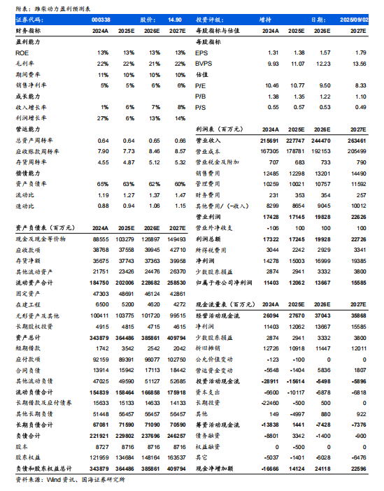 盈利预测和投资评级 2025年H2重卡有望持续景气、天然气重卡渗透率有望回升、大缸径和动力电池业务持续增长,三重因素使公司盈利具备较大向上弹性。我们预计公司2025-2027年实现营业总收入2277、2445与2635亿元,同比增速6%、7%与8%;实现归母净利润121、137与156亿元,同比增速为6%、13%与14%;EPS为1.38、1.57与1.79元,对应当前股价的PE估值分别为11、10与8倍,维持“增持”评级。