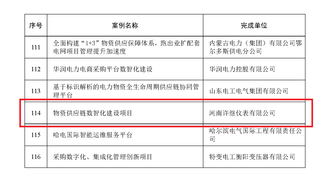 创新是第一动力许继电气坚持以供应链安全稳定为核心,推进数字化转型,提升产业链供应链韧性,通过持续推动供应链领域的创新与应用,所属许继仪表公司和山东电子分别获得中国电力企业联合会电力装备及供应链分会2024年度电力行业物资供应链创新与应用一、二级典型案例。