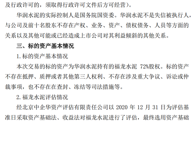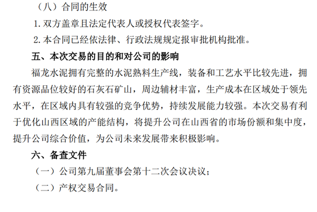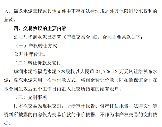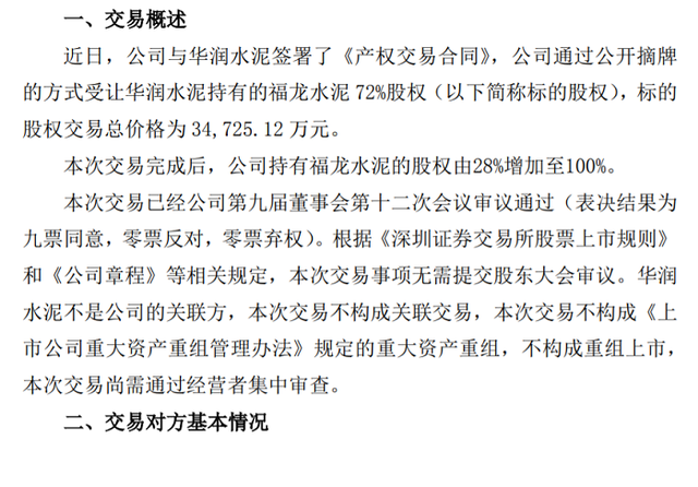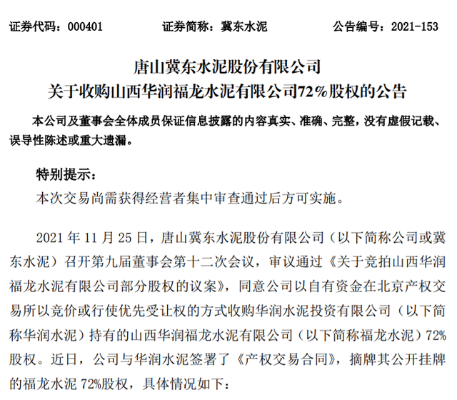12月15日,冀东水泥发布公告称,为进一步完善区域市场格局,优化公司在山西省水泥市场的布局、提升市场份额,提升公司核心竞争力,公司将在北京产权交易所以竞价或行使优先受让权的方式收购山西华润福龙水泥有限公司(以下简称福龙水泥) 72%的股权。交易完成后,公司将持有福龙水泥 100%的股权。