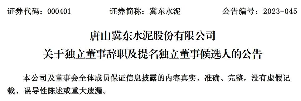 冀东水泥(000401)于9月27日发布公告称,唐山冀东水泥股份有限公司(以下简称公司或本公司)董事会于近日收到独立董事孔祥忠先生、姚颐女士的书面辞职报告。因连续担任独立董事已满六年,根据相关监管规定,孔祥忠先生、姚颐女士向董事会提出辞去本公司第九届董事会独立董事职务,同时一并辞去董事会专门委员会相关职务。辞职后,孔祥忠先生、姚颐女士将不再任职于本公司。