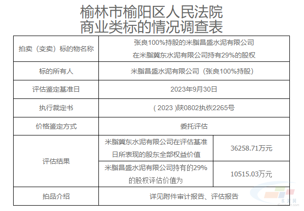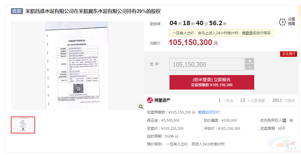 近日,某司法拍卖平台显示,米脂昌盛水泥有限公司变卖在米脂冀东水泥有限公司持有29%的股权,起拍价105,150,300元。唐山冀东水泥股份有限公司拥有优先购买权。