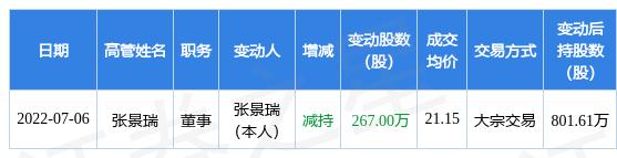 证券之星讯,根据7月7日市场公开信息、上市公司公告及交易所披露数据整理,派林生物(000403)最新董监高及相关人员股份变动情况:2022年7月6日公司董事张景瑞共减持公司股份267.0万股,占公司总股本为0.3643%。变动期间公司股价下跌3.92%,7月6日当日收盘报21.8元。