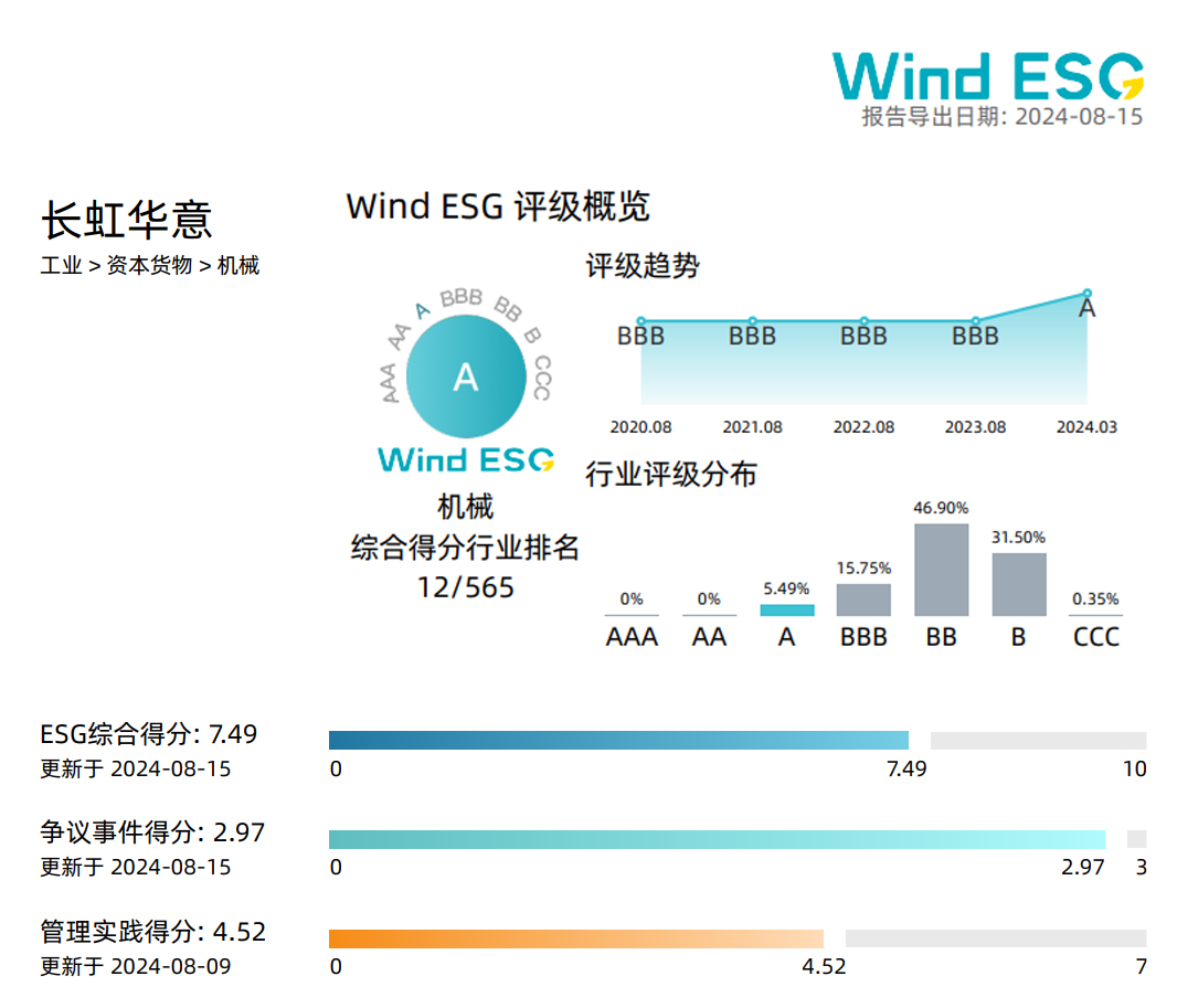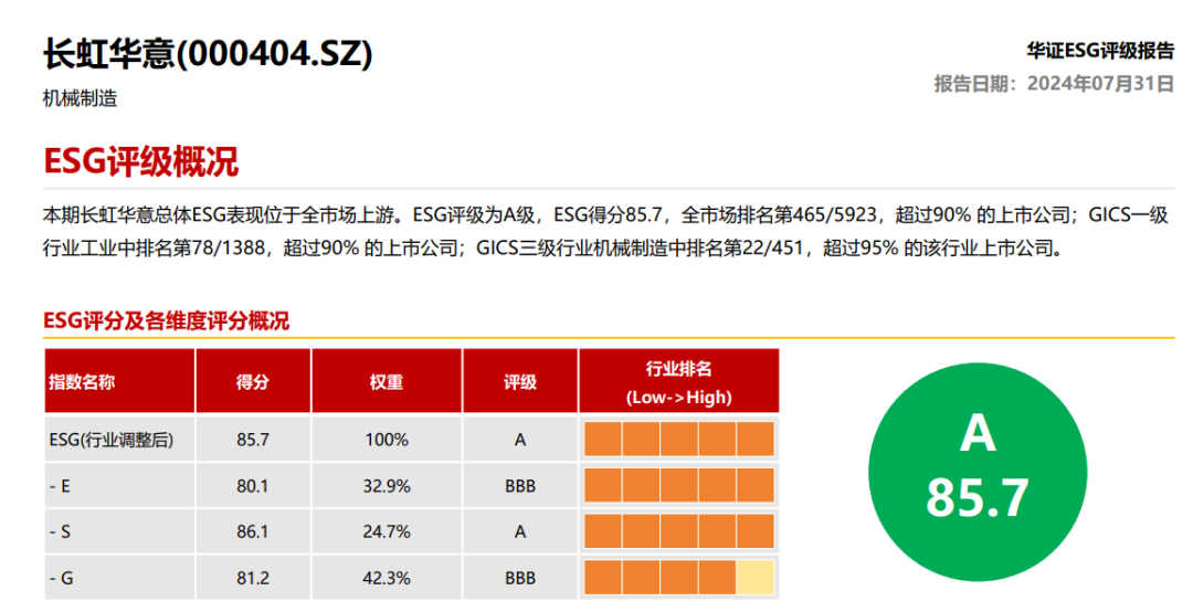 长虹华意发布的2023年度环境、社会及公司治理(ESG)报告获得了市场及权威评级机构的高度评价。万得(Wind)ESG评级中,由去年的“BBB”级提升至“A”级,综合评分排名位于565家同行业公司的第12名;华证ESG评级中,由“BBB”级提升至“A”级,排名超过95%的机械制造行业上市公司。