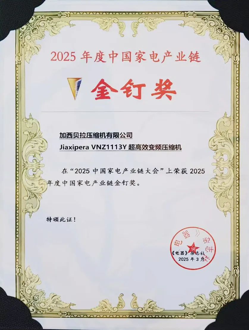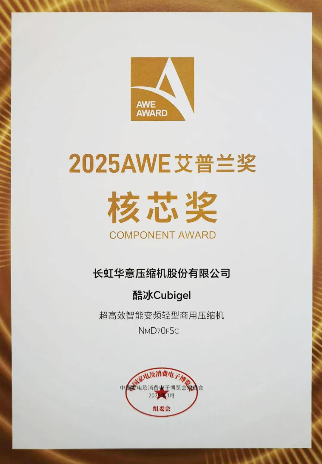 客户为本,价值为赢,长虹华意亮相AWE2025。加西贝拉VNZ1113Y高效变频压缩机、PK3189U大排量轻商用压缩机斩获AWE2025金钉奖。酷冰R290冷媒NMD70FSC变频商用压缩机斩获AWE2025艾普兰核芯奖;