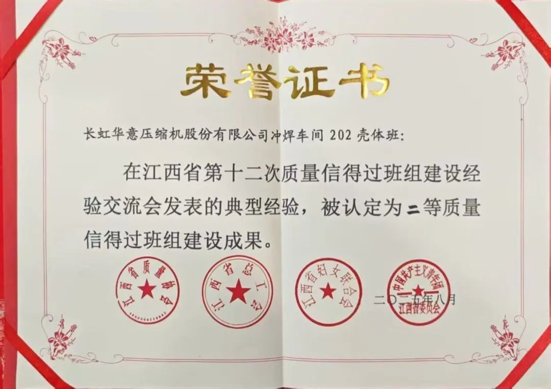 近日,江西省质量协会传来捷报,在江西省第十二次质量信得过班组建设典型经验交流发表会上,长虹华意公司选送的班组建设成果从众多优秀参赛单位中脱颖而出,凭借扎实的质量管理实践、创新的工作方法与显著的实施成效,一举斩获佳绩:电机车间TB线班组荣获一等奖,冲焊车间202壳体班组摘得二等奖,充分彰显了公司在质量管理与班组建设领域的深厚底蕴与领先实力。