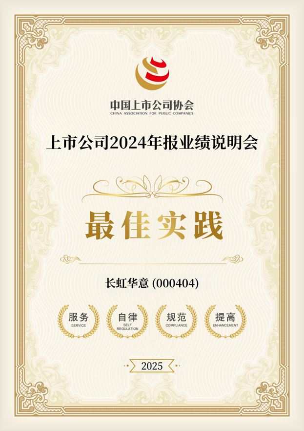 近日,中国上市公司协会发布了“2024年报业绩说明会最佳及优秀实践”企业榜单。长虹华意凭借精心的筹备组织、充实的沟通内容以及与投资者的有效互动,获评“上市公司2024年报业绩说明会最佳实践”,体现了公司在投资者关系管理方面的工作获得了专业认可。