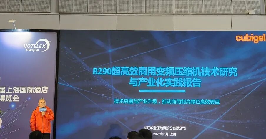 展会期间,公司商用研究所所长尹小兵受邀出席商厨冷链高质量发展论坛,并发表题为《R290超高效应用变频压缩机技术研究与产业化实践》的主题演讲,分享核心技术成果与产业化经验,受到行业高度关注。