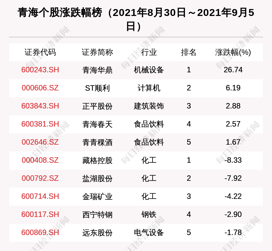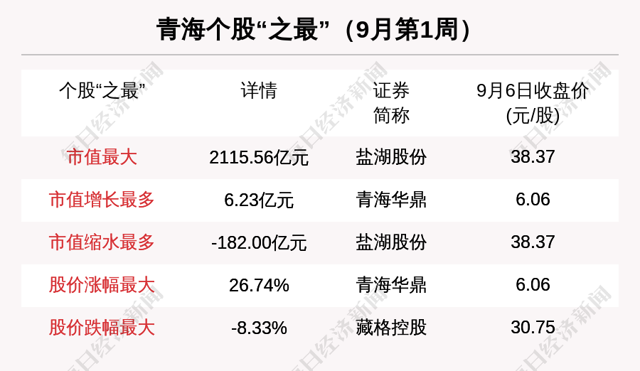 9月第1周(2021年8月30日~2021年9月5日),青海股中,青海华鼎市值增长最多;盐湖股份市值缩水最多;涨幅最大的是青海华鼎,上涨幅度为26.74%;跌幅最大的是藏格控股。
