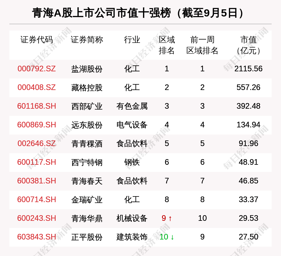 截至9月5日,青海板块市值最大的是盐湖股份,市值最小的是ST顺利。上周市值增长最多的是青海华鼎,增长6.23亿元;市值缩水最多的是盐湖股份,缩水182.00亿元。