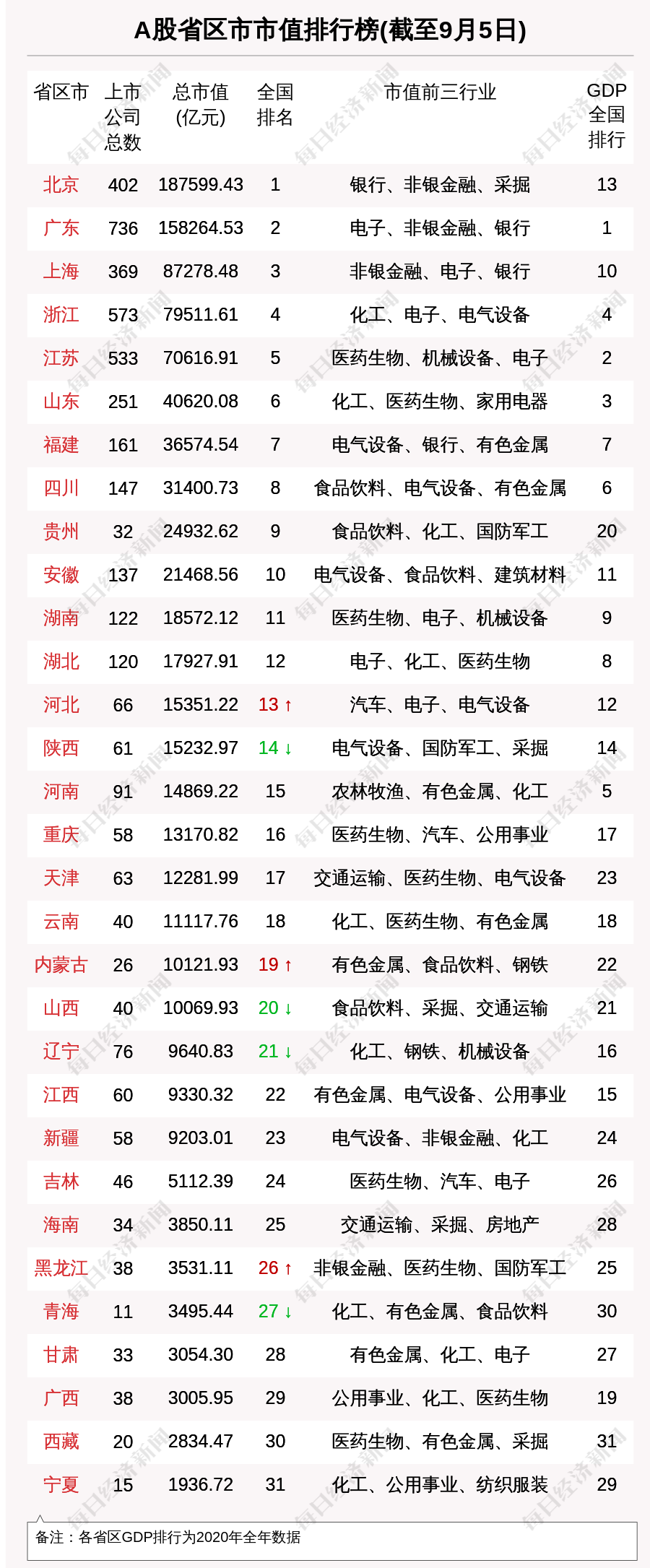 每经AI快讯,截至2021年9月5日,青海共有A股上市公司11家,板块总市值为3495.44亿元,全国排名第27位,较前一周减少231.86亿元。青海板块市值最大的是盐湖股份,市值2115.56亿元。