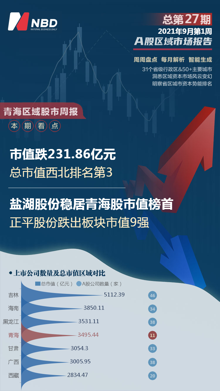 市值方面,截至2021年9月5日,青海板块总市值为3495.44亿元,较前一周3727.30亿元,缩水6.22%(加权平均)。