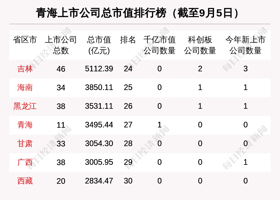 从全国来看,9月第1周青海板块总市值被黑龙江超过,全国排名第27位。相比第26名黑龙江,少了35.67亿元。从区域来看,青海板块总市值西北排名第3。(省区市排名未统计中国香港、澳门、台湾)