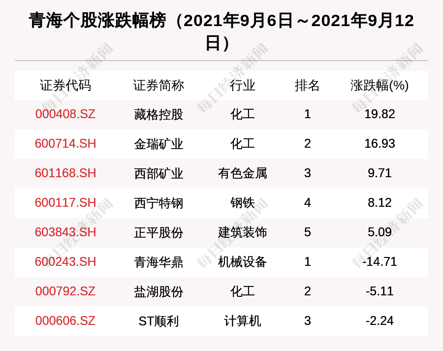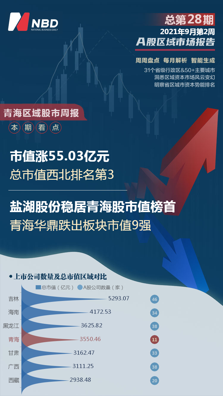 涨跌幅方面,截至2021年9月12日,青海板块市值与前一周相比,区间涨幅为2.49%(加权平均值),涨幅排名全国第28位。