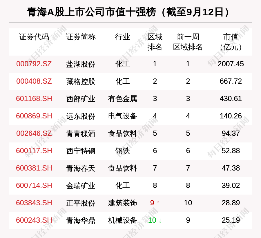 盐湖股份稳居青海股市值榜首,青海华鼎跌出板块市值9强
