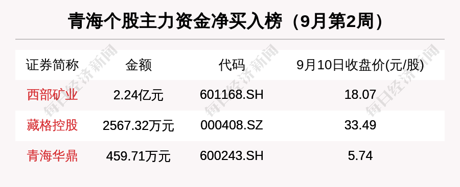 主力资金方面,9月第2周,西部矿业净买入额居首位,为2.24亿元,其次是藏格控股(2567.32万元)和青海华鼎(459.71万元)。
