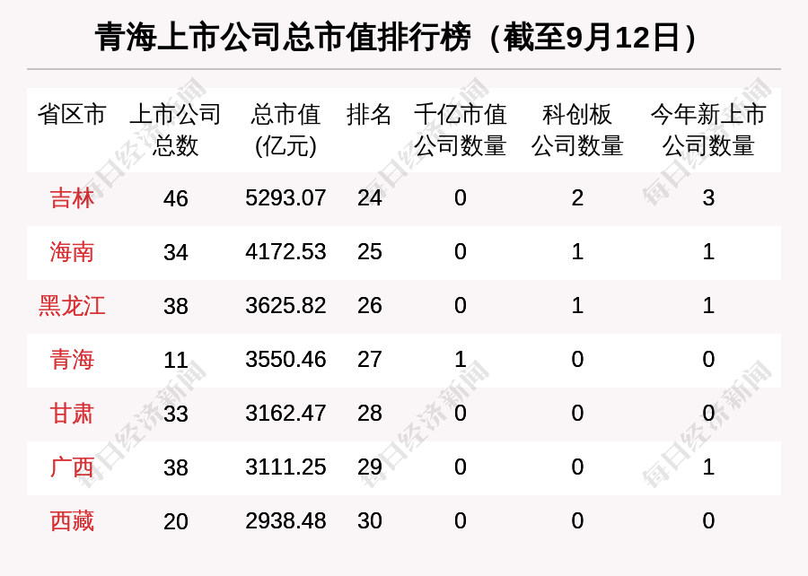 市值方面,截至2021年9月12日,青海板块总市值为3550.46亿元,较前一周3495.44亿元,增长1.57%(加权平均)。