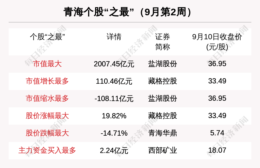 9月第2周(2021年9月6日~2021年9月12日),青海股中,藏格控股市值增长最多;盐湖股份市值缩水最多;涨幅最大的是藏格控股,上涨幅度为19.82%;跌幅最大的是青海华鼎。