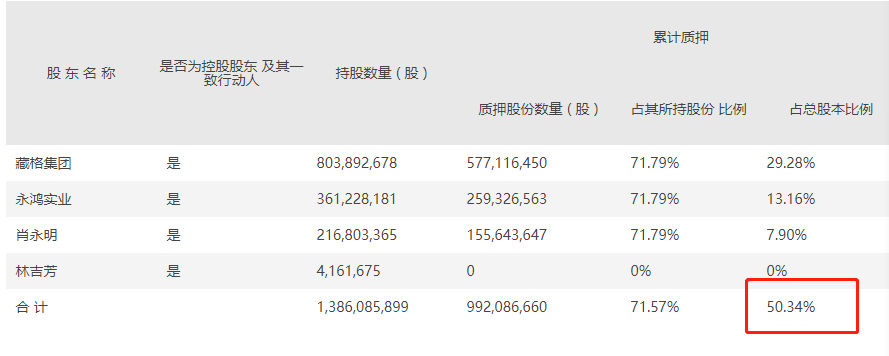 根据2020年12月底公布的数据,藏格矿业控股股东藏格集团及其一致行动人永鸿实业、肖永明、林吉芳累计被冻结股份数量14.67亿股,占所持股份数量比例100%,占公司总股本73.58%,全部冻结状态。藏格集团及其一致行动人作为主债务人已到期未归还有息负债金额共计80.03亿元,因履行担保义务所涉及已到期未归还有息负债金额共计6.36亿元,其中涉及股票质押诉讼金额为76.9亿元。