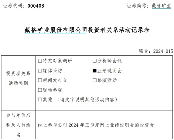 10月17日晚间,上市公司藏格矿业发布了《投资者关系活动记录表》,披露公司举办了2024 年三季度网上业绩说明会,公司董事长肖宁、财务总监田太垠、董事会秘书李瑞雪等参与并解答投资者提问。