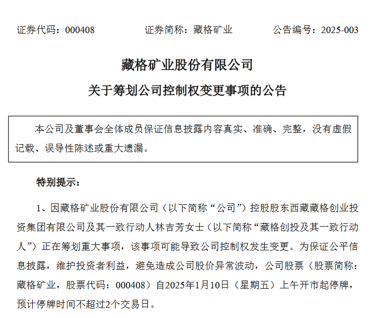 藏格矿业股份有限公司(下称“藏格矿业”)1月9日发布公告称,公司控股股东西藏藏格创业投资集团有限公司及其一致行动人林吉芳(以下简称“藏格创投及其一致行动人”)正在筹划重大事项,该事项可能导致公司控制权发生变更。藏格矿业股票自2025年1月10日(星期五)上午开市起停牌,预计停牌时间不超过2个交易日。