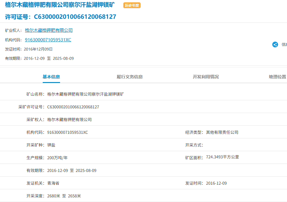 全国矿业权人勘察开采信息管理系统显示,藏格钾肥旗下察尔汗盐湖钾镁矿登记的开采矿种仅为钾盐,生产规模200万吨/年。