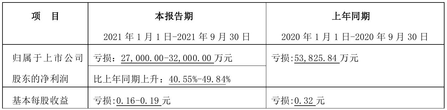 挖贝网10月14日,ST沈机(000410)近日发布2021年前三季度业绩预告公告,预计2021年前三季度实现归属于上市公司股东的净利润为亏损27000.00万元–32000.00万元,比上年同期亏损减少40.55%–49.84%。