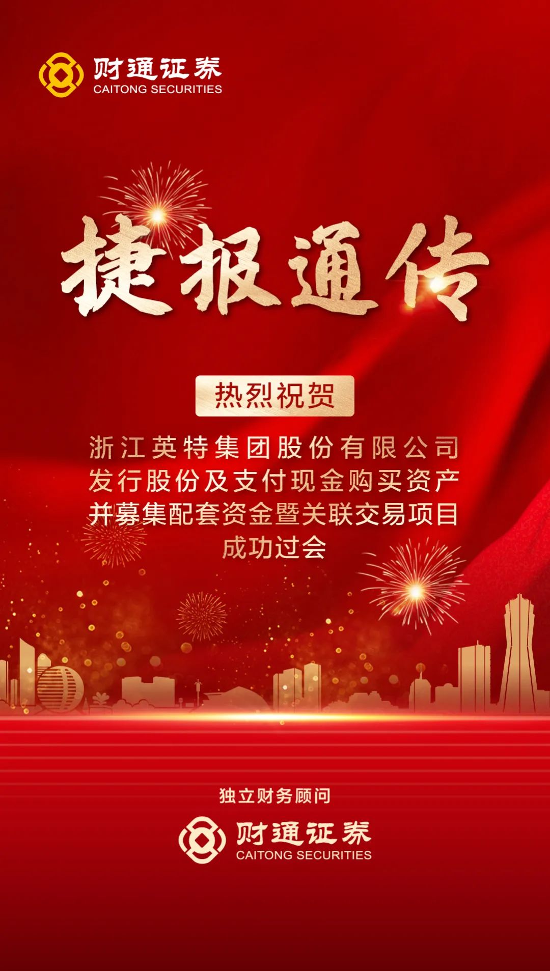 2023年1月31日,由财通证券担任独立财务顾问的浙江英特集团股份有限公司(以下简称“英特集团”)发行股份及支付现金购买资产并募集配套资金暨关联交易项目通过了中国证监会上市公司并购重组审核委员会2023年第2次会议审核,成为A股市场兔年首单过会的并购重组项目,财通证券股权业务喜迎开门红。