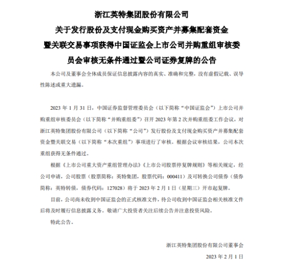 中国经济网北京2月1日讯昨日晚间,英特集团(000411.SZ)披露公告称,1月31日,中国证券监督管理委员会上市公司并购重组审核委员会召开2023年第2次并购重组委工作会议,对公司发行股份及支付现金购买资产并募集配套资金暨关联交易事项进行了审核。根据会议审核结果,公司本次重组获得无条件通过。