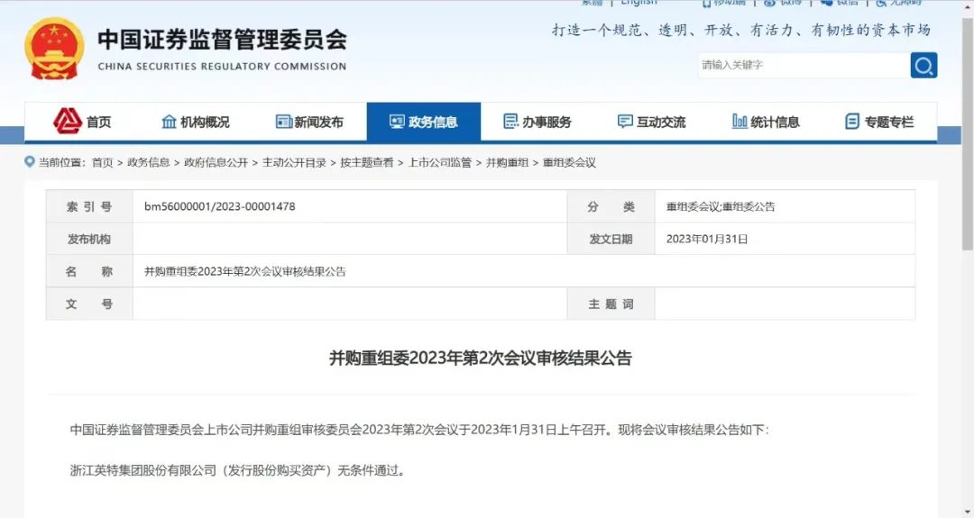 2023年1月31日,公司党委书记、董事长应徐颉带领公司董事会秘书谭江、财务负责人金小波以及独立财务顾问财通证券等中介机构组成的答辩团队,向中国证监会并购重组审核委员会就公司重大资产重组事项进行了汇报和问题答辩,经其审核,我司重大资产重组项目获得无条件通过。