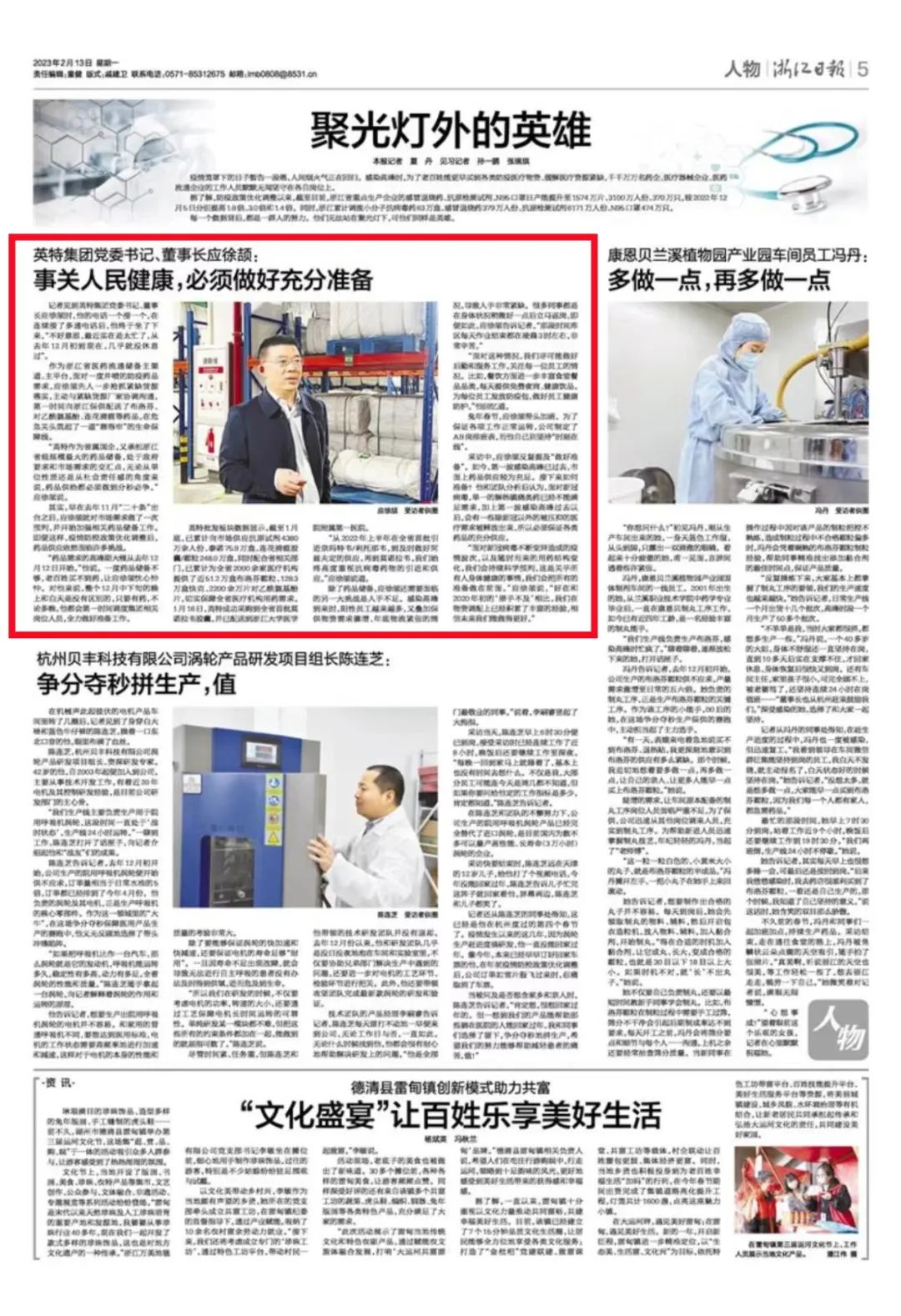 2月13日,《浙江日报》刊登英特集团党委书记、董事长应徐颉专访文章《事关人民健康,必须做好充分准备》。专访聚焦“聚光灯外的英雄”,展现感染高峰时,千千万万名药企、医疗器械企业、医药流通企业的工作人员,为了老百姓能更早买到各类防疫医疗物资、缓解医疗资源紧缺,默默无闻坚守在各自岗位上的战疫事迹。“每一个数据背后,都是一群人的努力。他们无法站在聚光灯下,可他们同样是英雄。”一起来看详细报道——