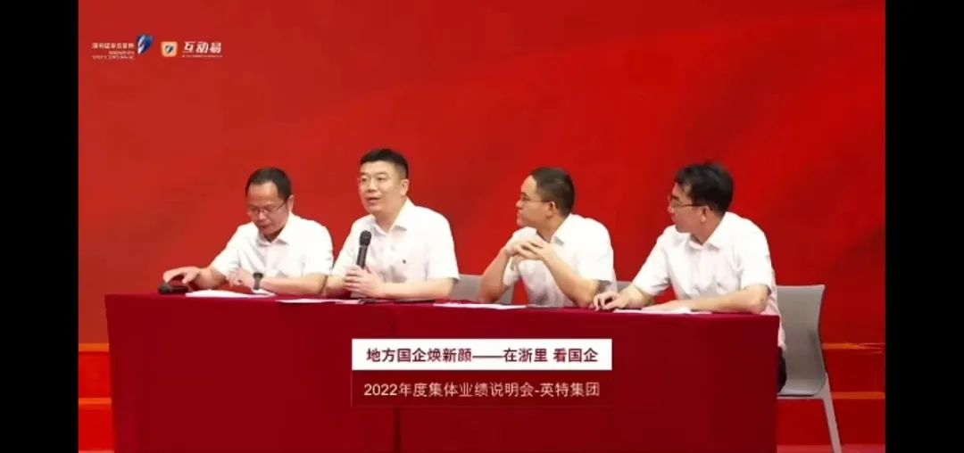 5月17日,深圳证券交易所上市大厅,浙江省国资委联合深圳证券交易所共同举行“地方国企焕新颜——在浙里看国企”浙江国有控股上市公司2022年度集体业绩说明会暨“走进深交所”活动。浙江省国资委党委委员、副主任顾涛出席活动并致辞。英特集团作为5家在深交所挂牌的浙江国有控股上市公司代表之一,作业绩说明并集中回答了投资者提问。公司党委书记、董事长应徐颉,党委委员、董事、副总经理费荣富,独立董事陈昊(线上),董事会秘书谭江,财务负责人曹德智参加了本次业绩说明会。