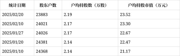 从2月28日公开信息显示,英特集团截至2025年2月20日公司股东户数为2.39万户,较上期(2025年2月10日)减少138户,降幅为0.57%,变化不大。