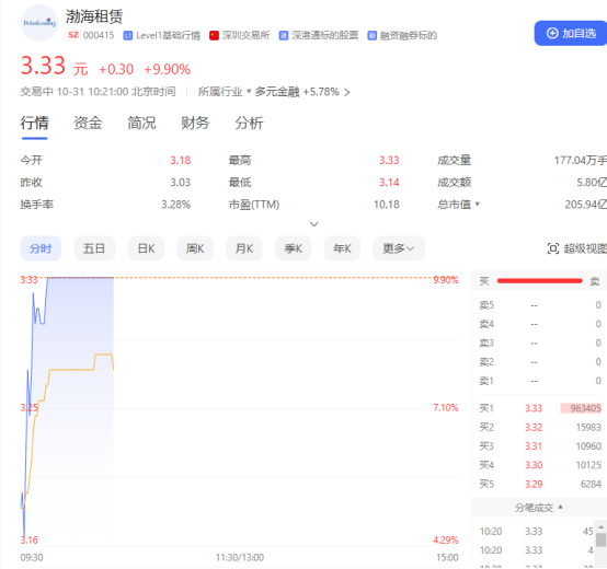 10月31日早盘,渤海租赁开盘涨近5%,随后该股持续上行,盘中触及涨停,截至10:21分,该股报3.33元每股,涨幅为9.9%,涨停封单近百万手。