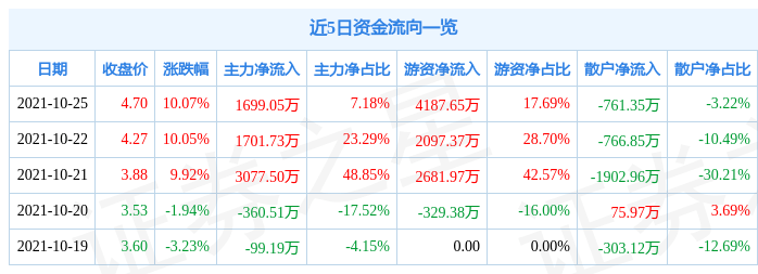 资金流向数据方面,当日主力资金净流入1699.05万元,游资资金净流入4187.65万元,散户资金净流出761.35万元。近5日资金流向一览见下表: